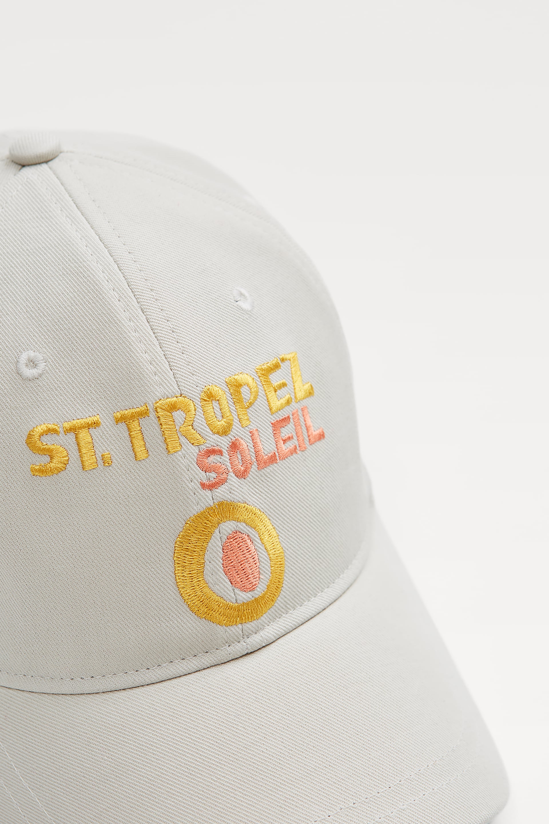 It has a classic baseball cap shape. It is made from an organic cotton material which has Resorts artwork embroidered on the front. It has an adjustable velcro tab at the back. Ventilation eyelets are embroidered on top to keep you cool. It originally comes from Italy.